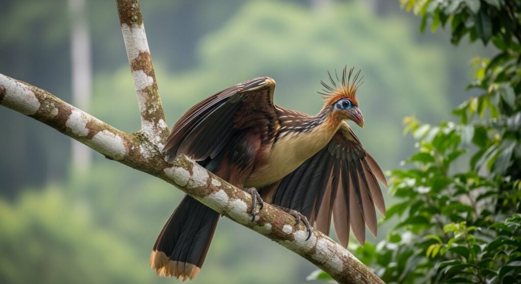 Amazon chicks sport dinosaur claws on wings to scramble trees if nests flood. Lose ’em later like training wheels. Adults stink like cow farts from leaf gut brew. Predators gag and bounce. Swamp survival kit.