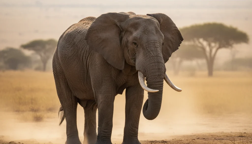 African elephant strides plains huge, trunk swinging slow through dust. Being near is trumpets rare then stomps if edged wrong. Sometimes gentle with young, contradiction soft. The size repeats awe, pulls back mild. Not fully tamed wild.