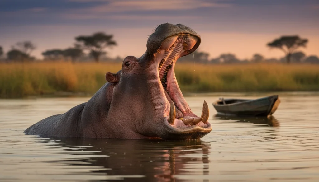 Hippopotamus lumbers river edges, massive jaws hidden half submerged most times. Existing there means sudden charges from calm, boats flipped easy. Sometimes they graze peaceful, mild bend in herds. To cross paths pulls unsure speed. Feels bulky harmless, then risk flashes.
