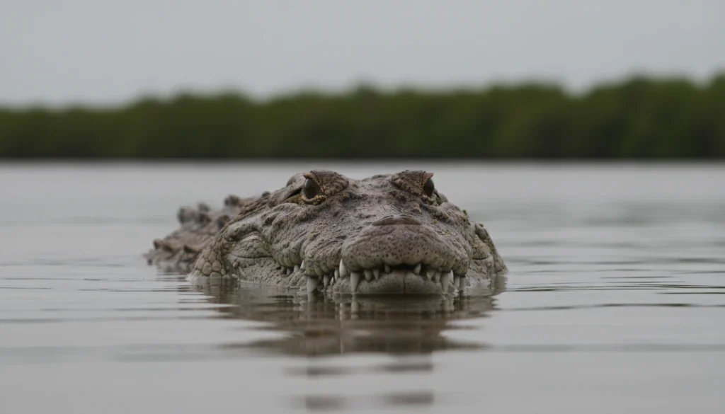 Saltwater crocodile waits murky still, eyes barely above in coastal flows. It snaps fast from nowhere, grip that crushes bone quiet. Days pass unseen, repetition light in hunts. Owned territory feels owned deadly. Uncertainty with shallows crossed.