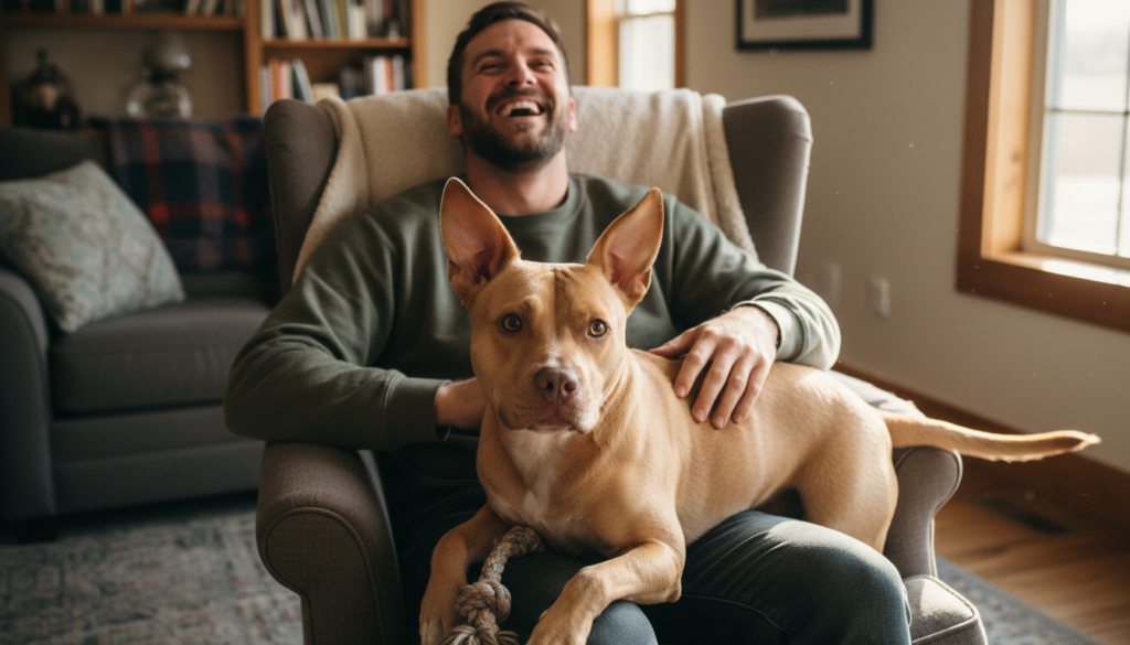 That classic drops, ears perk sky-high. Trainer Jake’s pit bull rescue melted first time went from shelter skittish to lap hog. Hits the praise center like candy.