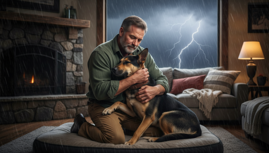 Quiet during storms, paws plant steady. Kennel boss Hal’s fear-biter chilled thunder nights post-phrase. Cling word screams protection.