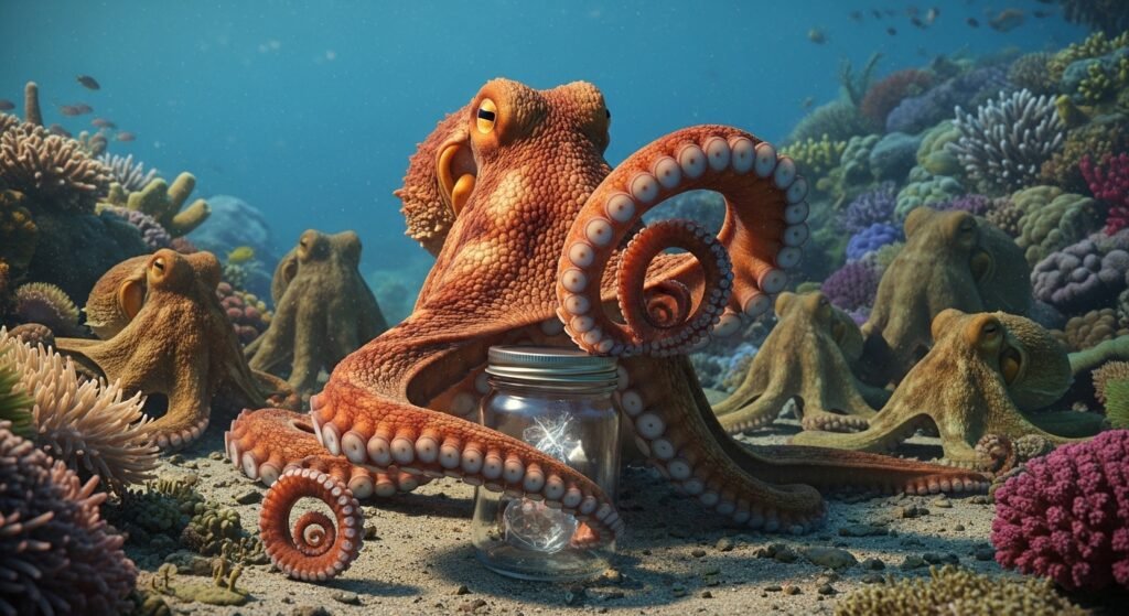 Octopuses are notorious for escaping fences by coiling lids, slipping through drainage pipes, or squeezing through gaps as small as their beaks. Their boneless bodies allow extreme flexibility, making constraint a constant challenge for experimenters and aquarists likewise.