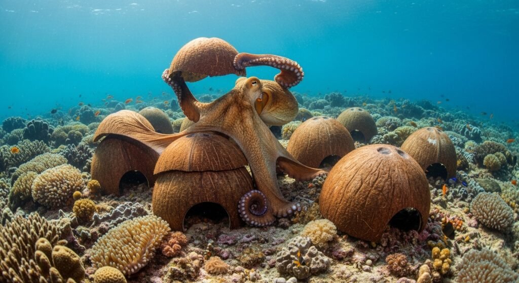 Some octopus species collect coconut shells, seashells, or monuments and carry them for unborn use as harbors or protective walls. This behaviour demonstrates advanced planning, a particularity infrequently observed in pets. Tool use places octopuses among a very small group of creatures able of similar foresight.