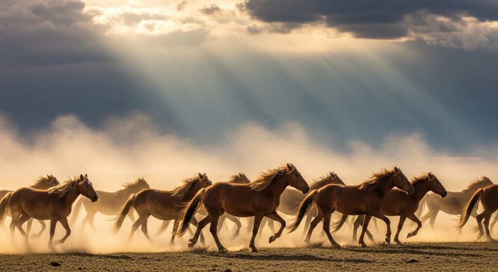 Wild horses calculate herd dynamics and speed for safety. When attacked, they fled together, guided by a dominant existent. Rather than fighting attackers, their strategy is to overrun them across open areas.
