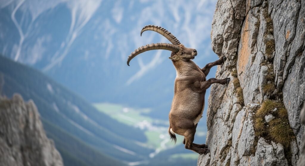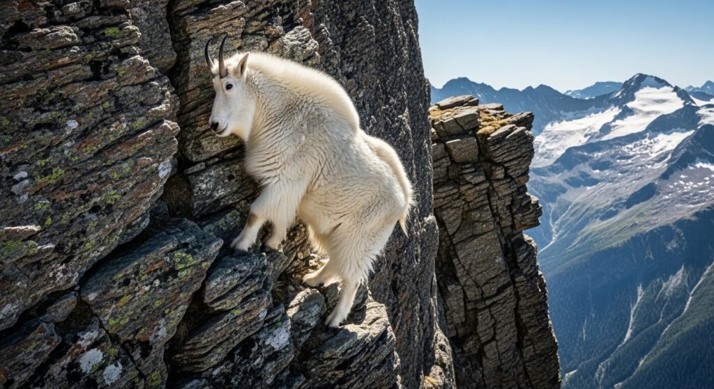 Mountain goats calculate on escape by climbing rather than fighting. When attacked, they move to a steep, rocky environment where attackers struggle to follow. Their technical hooves give exceptional grip on narrow legs.