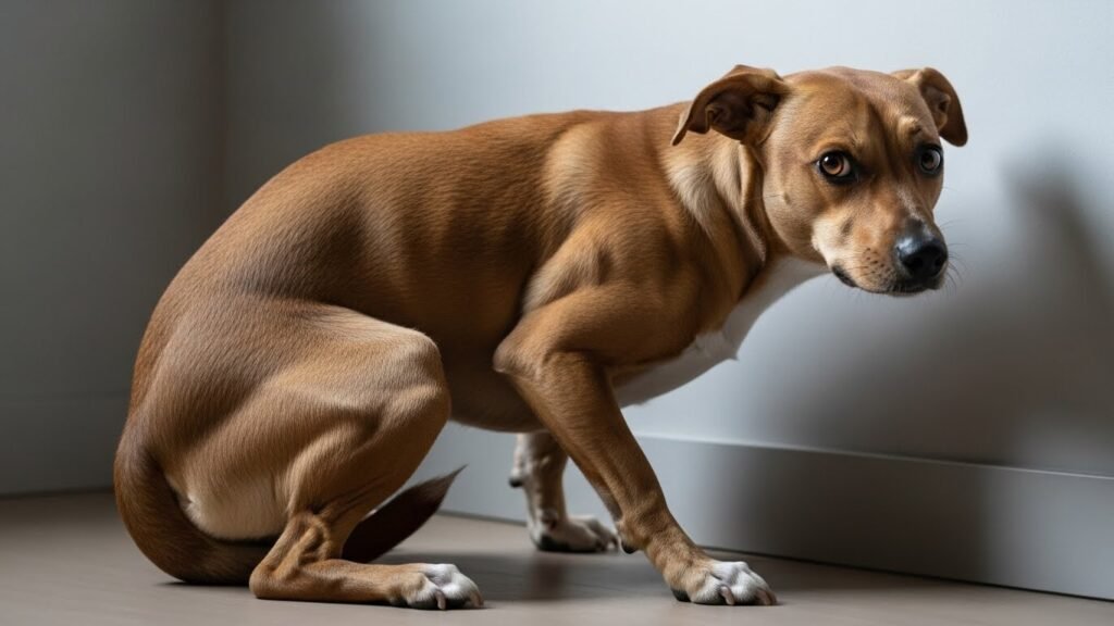 Hunkering with tense muscles shows fear-grounded discomfort. This posture frequently precedes protective actions if the stressor remains.