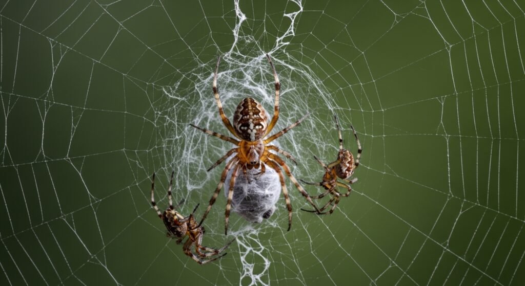 Certain spider species live communally and quest as a group. When prey becomes trapped in a participating web, multiple spiders rush in simultaneously. This reduces the threat to any one existent and allows them to subdue much larger prey. Cooperative web conservation also ensures the stalking structure remains effective.
