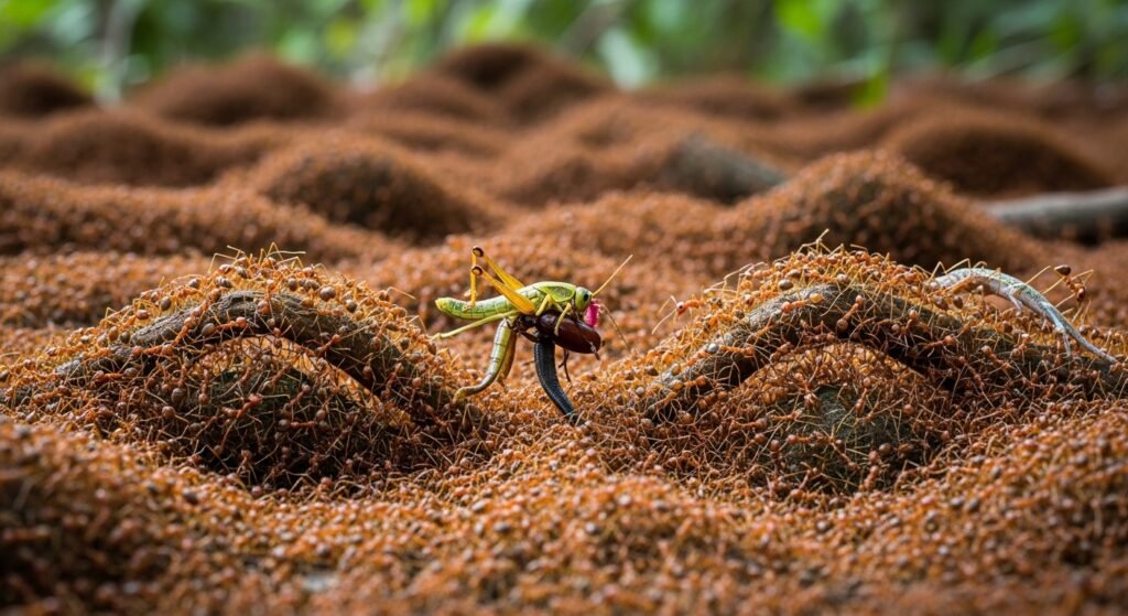 Army ants calculate on massive collaborative masses to overwhelm prey. Individualities form living islands and pathways to maintain the inflow of the colony during hunts. Their collaborative movement flushes out insects, reptiles, and indeed small mammals. While no single ant is dominant, the coordinated mass functions as a largely effective stalking machine.