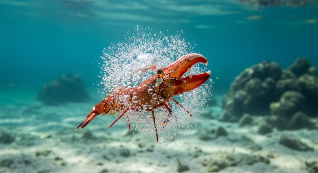 This small shrimp produces one of the loudest natural sounds in the ocean by snapping a technical claw shut. The action generates a high-speed water spurt that forms a collapsing bubble, briefly reaching temperatures similar to the sun’s face and stunning near prey.