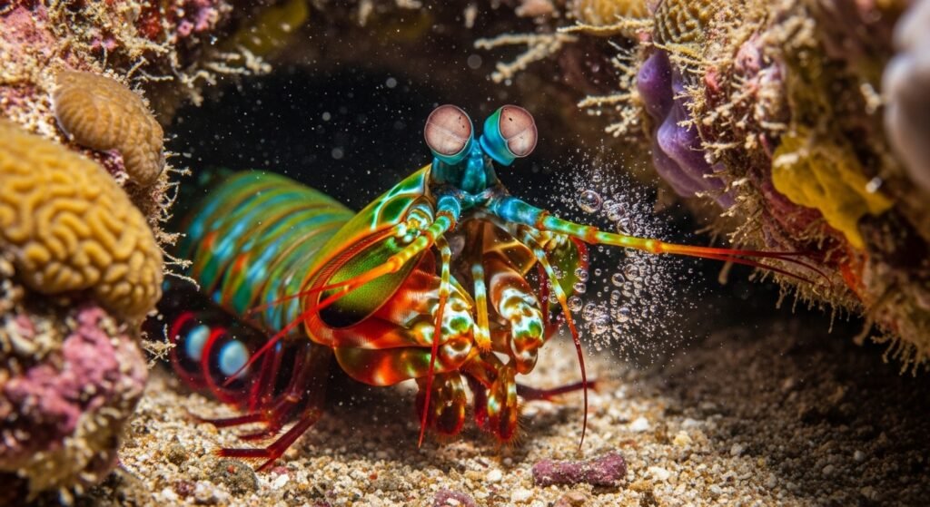 This marine wildlife possesses one of the most complex visual systems known. While humans have three types of color receptors, mantis shrimp have up to sixteen. Their eyes can describe polarized light and ultraviolet wavelengths unnoticeable to most creatures. Indeed more astonishing is their stalking strike, a club-like accessory that accelerates with similar speed it creates cavitation bubbles that collapse with explosive force.