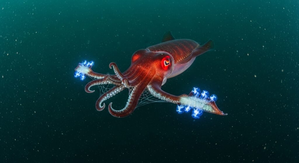Despite its name, the shark squid neither hunts aggressively nor feeds on blood. Living in oxygen-poor depths where most wildlife can not survive, it conserves energy by drifting and feeding on marine “snow” organic debris sinking from upper waters.