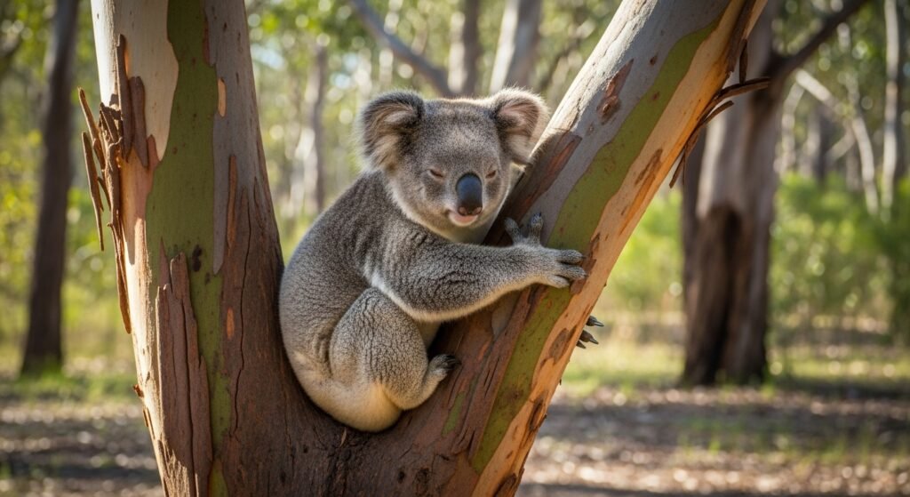 The koalas are arboreal marsupials and their habitats include eucalyptus trees located in Australia. Koalas feed on eucalyptus leaves and also sleep for more than 20 hours a day to save energy through their stay on the tree branches.