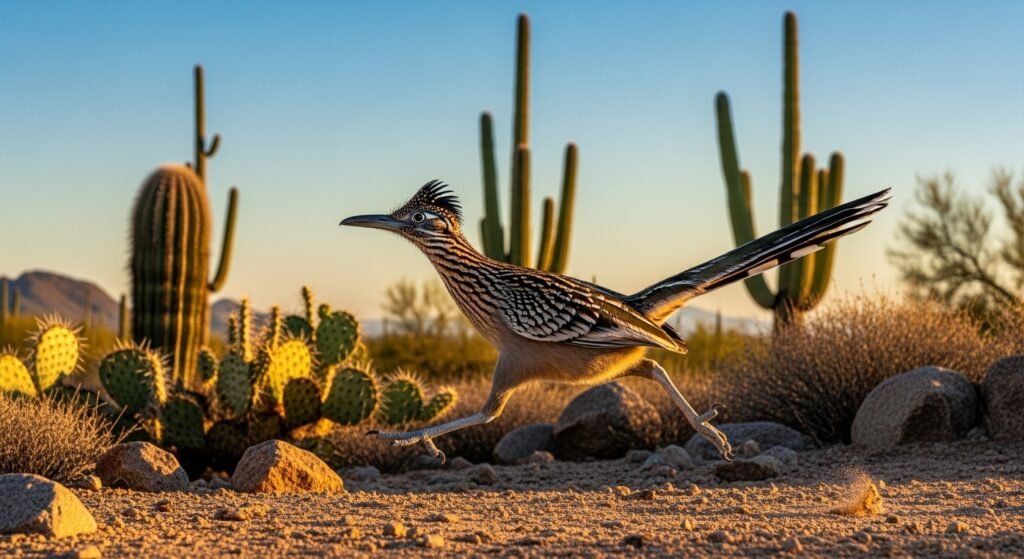Built for desert survival, it uses speed to capture reptiles and insects while avoiding wildlife. Its long legs and tail balance allow precise high-speed maneuvering across an uneven environment.