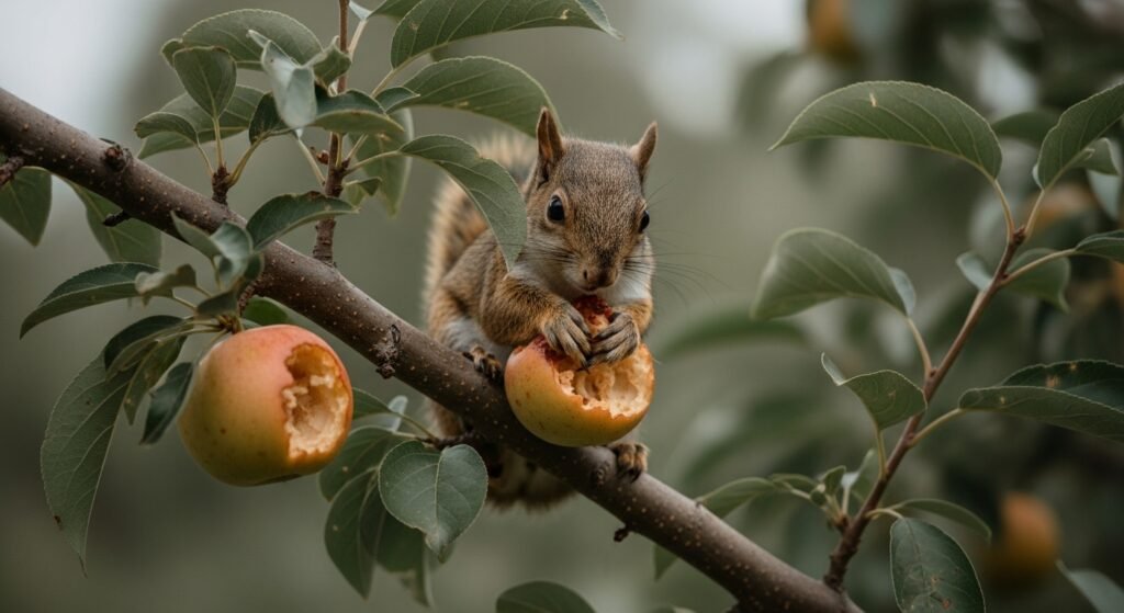Vegetable ground with tomatoes, or pumpkins give high nutritive value. Squirrels frequently eat fruits quickly, leading to wide damage.