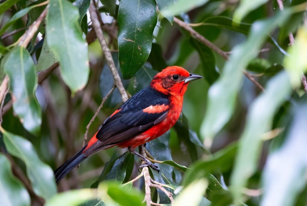 The Scarlet Tanager captivates spectators with its deep red body and differing black bodies. It inhabits mature evanescent timbers in the eastern United States during summer. Although visually striking, it frequently remains retired high in tree tents, making sightings especially satisfying for birdwatchers.