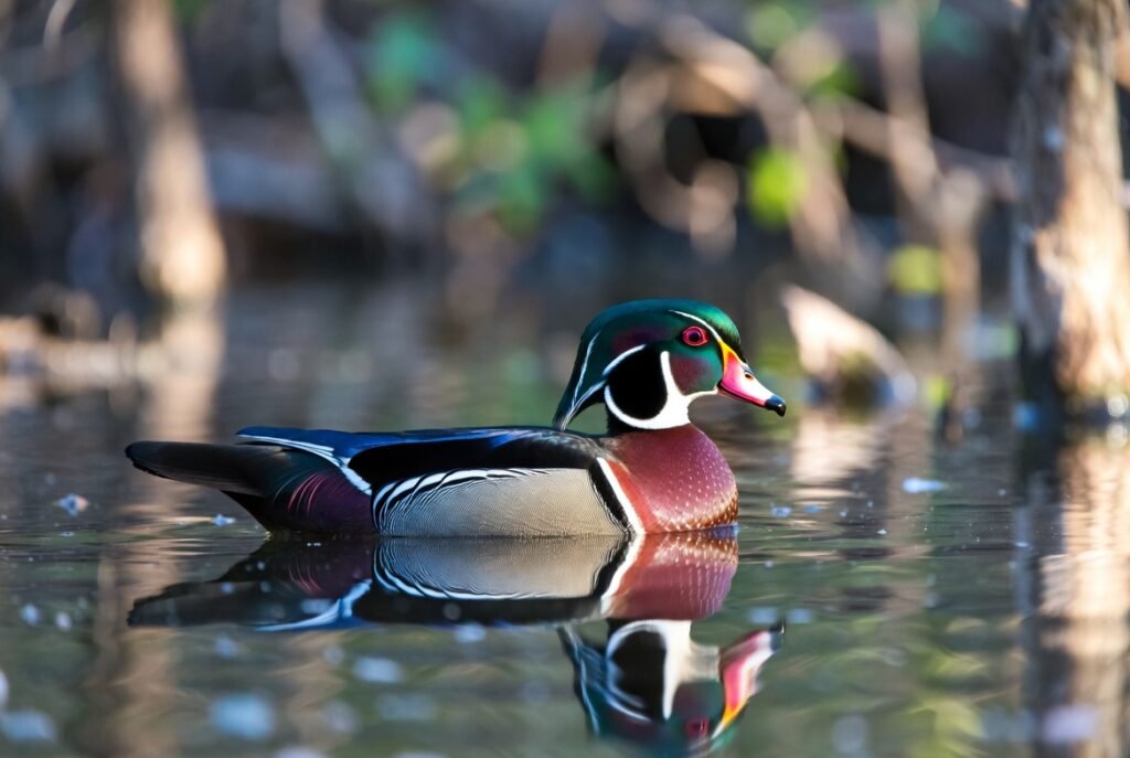 Considered one of the most beautiful waterfowl in North America, the Wood Duck features opalescent green, grandiloquent, groaner, and white markings. It inhabits wooded washes, and wetlands. Unlike numerous ducks, it frequently nests in tree depressions, adding to its oneness.