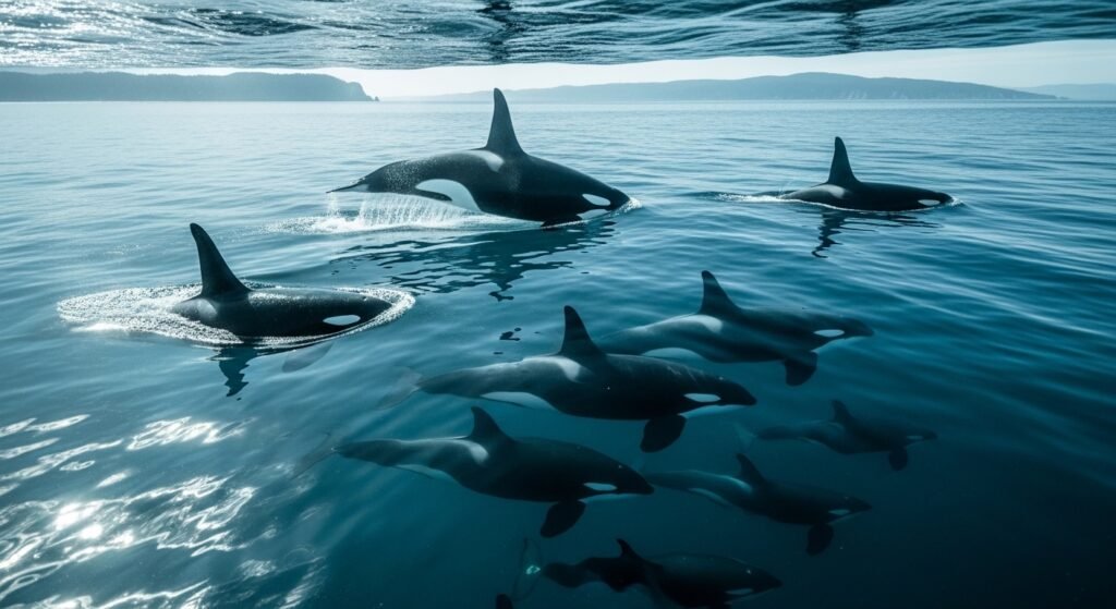 Their bold black-and-white achromatism creates striking descriptions as they glide through ocean waters. Largely intelligent and social, orcas move with royal grace, whether hunting, or swimming in capsules. Their presence is both beautiful and important, inspiring admiration wherever they appear.