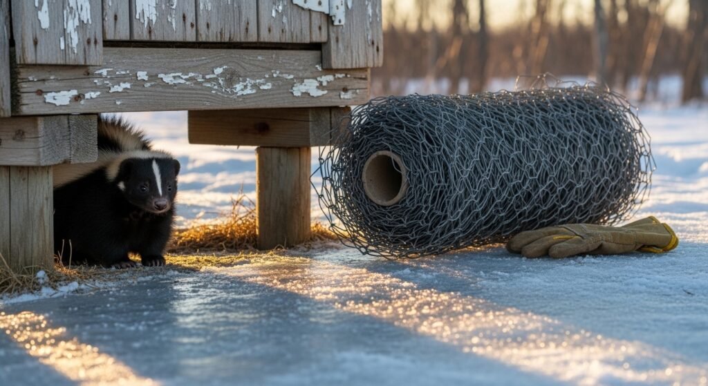 Skunks may seek shelter under balconies, galleries, or shanties. After icing the skunk has left, check these areas and seal any openings with tackle fencing. This prevents skunks from coming to your property.