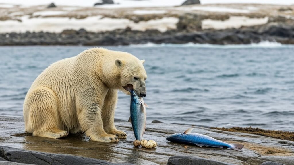 While seals remain the primary food source, polar bears are decreasingly consuming eggs, foliage, fish, and indeed small mammals. This salutary trial reflects real-time adaption to food failure during ice-free ages.