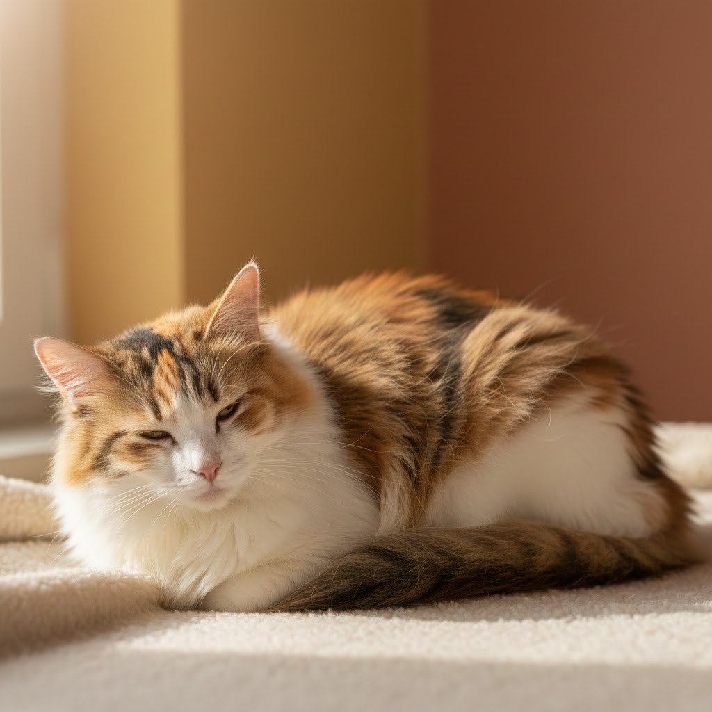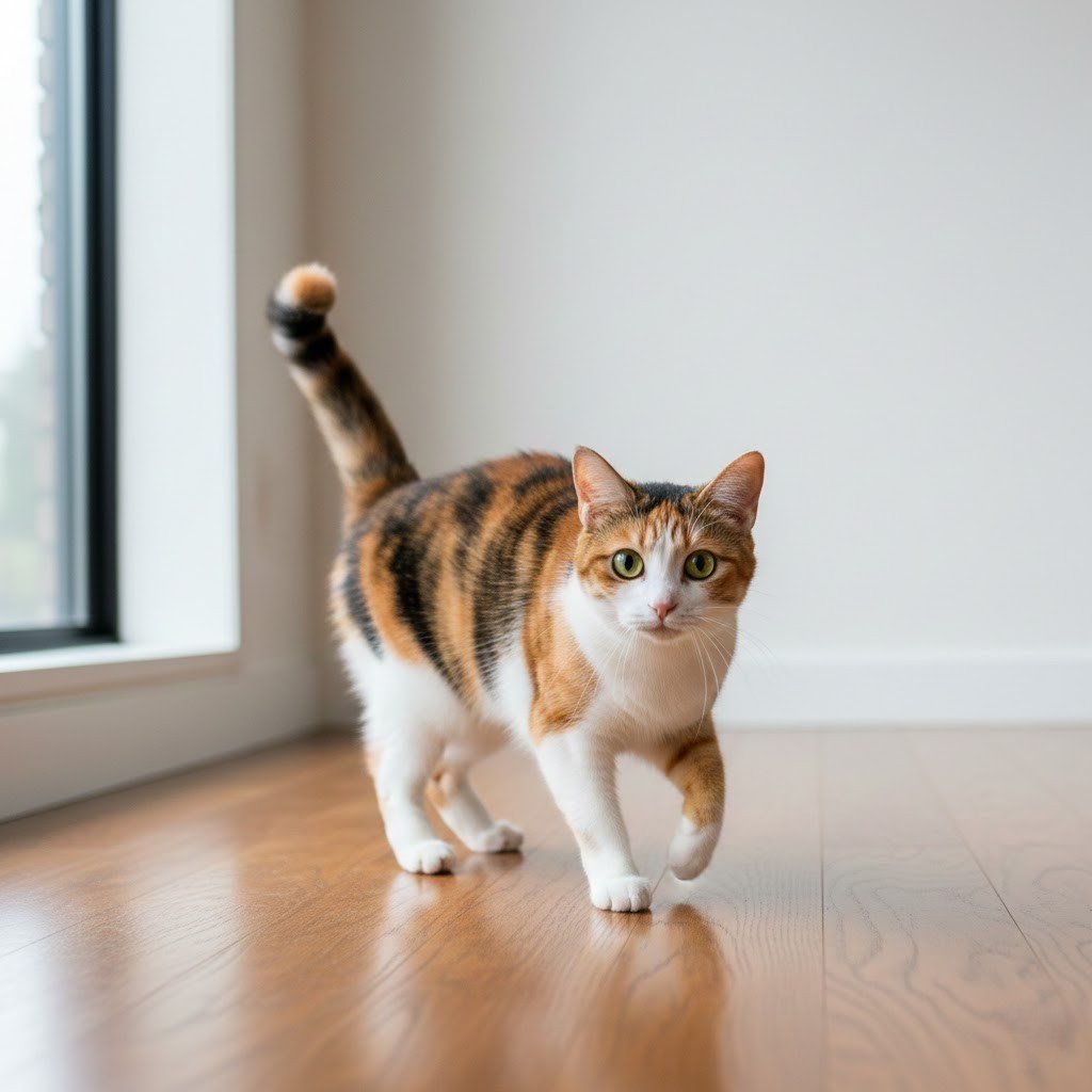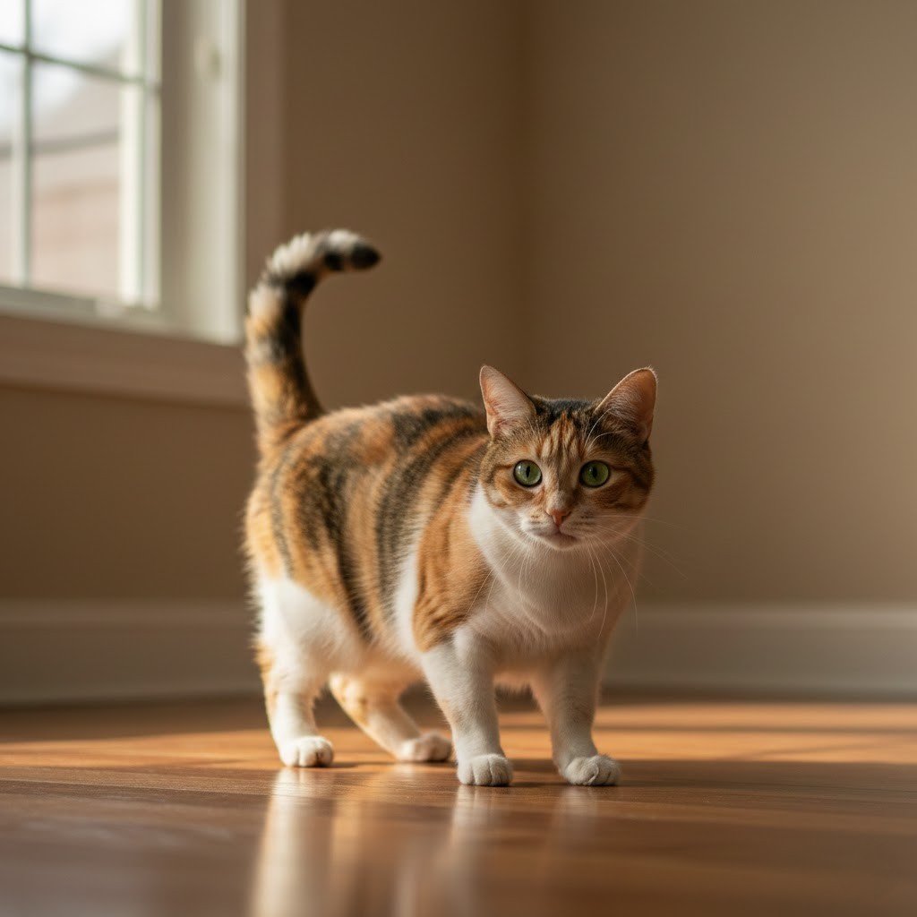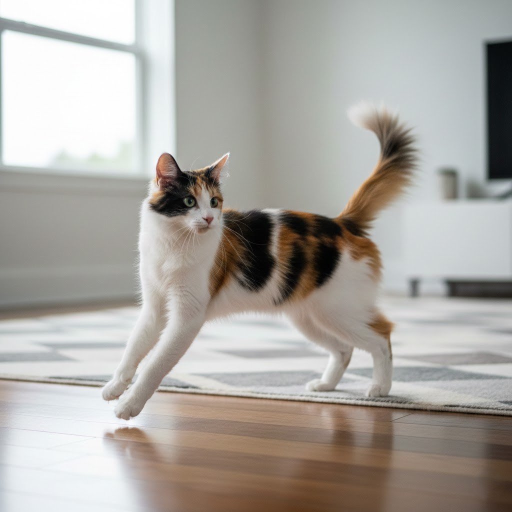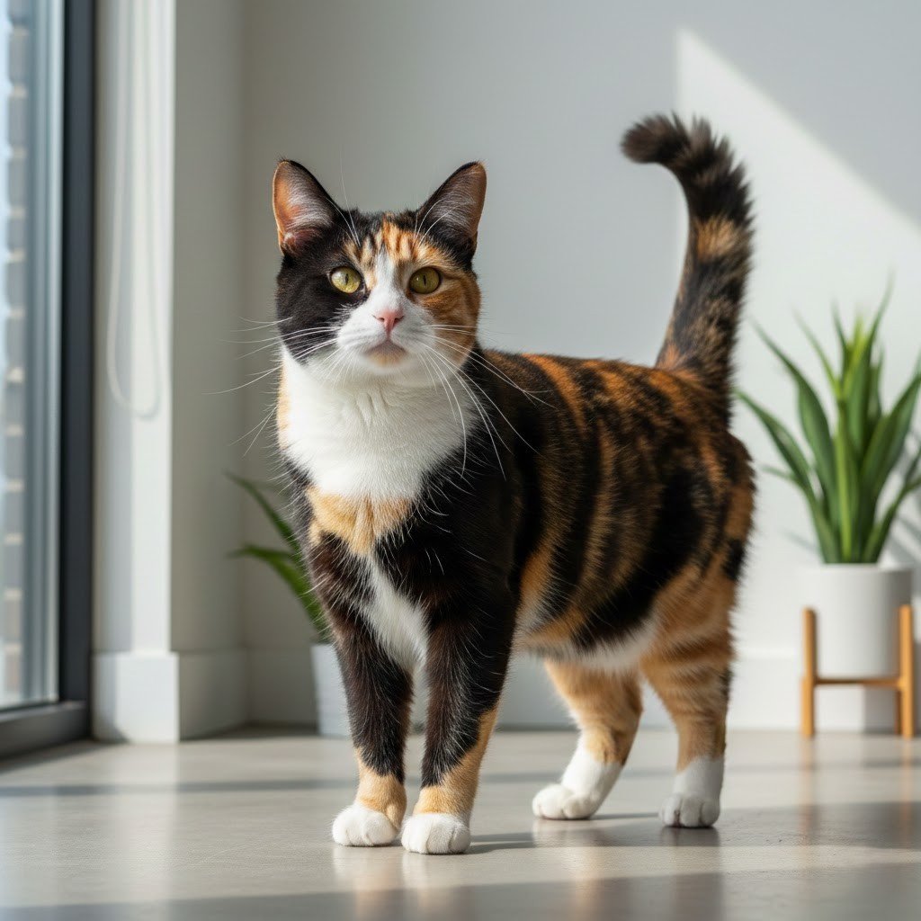 The Manx calicos are characterized by naturally short or missing tails and powerful hind legs. They are clever, mischievous, and can have very strong attachments with their owners.