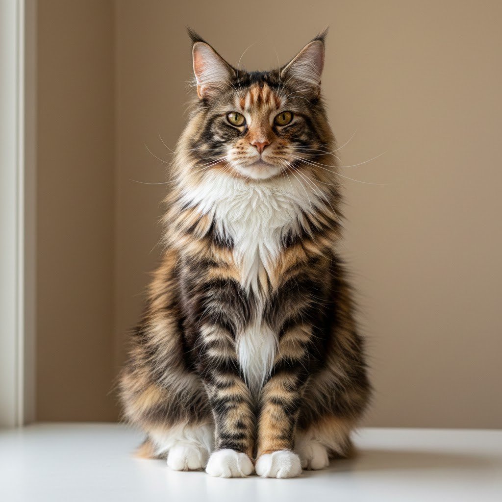 The Maine Coon calico is a breed with great size, ears, tufted and luxurious fur giving dark calico coloration a splendid show. Although they look impressive, they are friendly social cats that are usually described as friendly and smart.