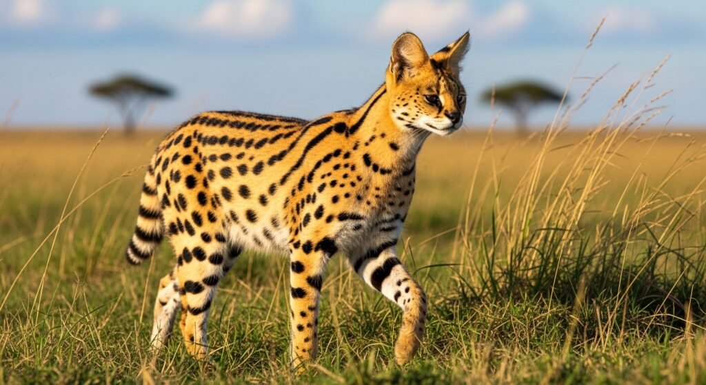 Servals display violent golden fleeces covered in large black spots and stripes. These markings are among the most dramatic of any wild cat. The elongated legs and upright ears complete the vision of lawn movement, blending wildlife and geography into a single visual meter.