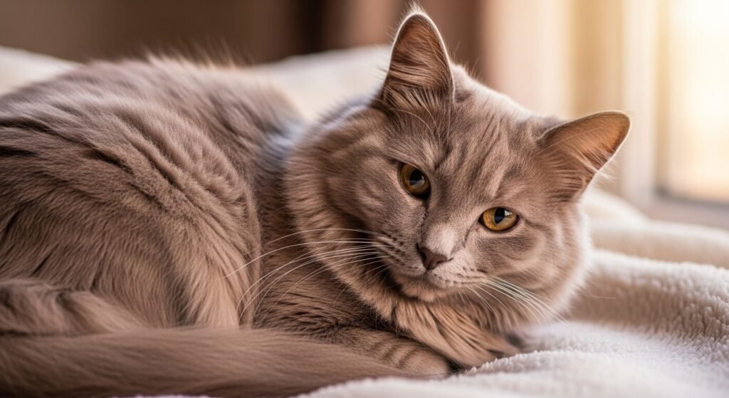 Lilac cats display a soft grayish-pink tone created when chocolate color undergoes dilution. This two-step inheritable combination chocolate plus dilution makes lilac one of the rarest naturally being fleece colors. The fur frequently appears argentine with a subtle pink warmth, especially in natural light.