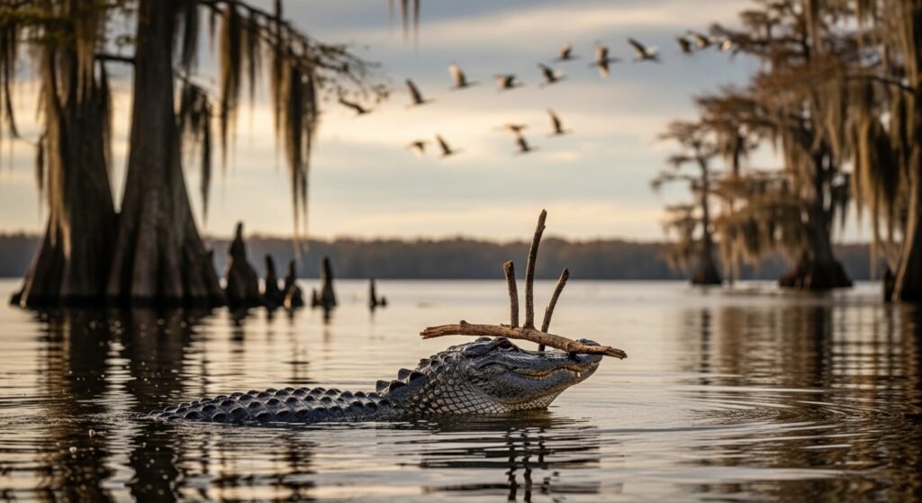 American alligators have been observed balancing sticks on their snouts during birds nesting season. The behaviour attracts birds searching for nest-structure material, bringing prey within striking range. Tool use like this is rare among reptiles and suggests advanced behavioral timing linked to seasonal patterns.