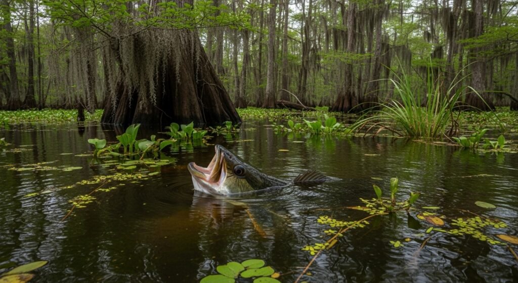 The bowfin possesses a gas bladder that functions like a lung. It can gulp atmospheric oxygen and survive in stagnant, low-oxygen wetlands. Strong fins allow short bursts of movement across muddy ground when water situations drop.