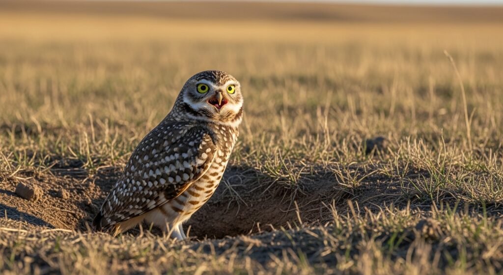 Burrowing owls produce a hissing call that nearly resembles a rattlesnake’s warning. The belittlement deters wildlife entering their underground nests. Aural deception like this is an uncommon protective strategy among birds.