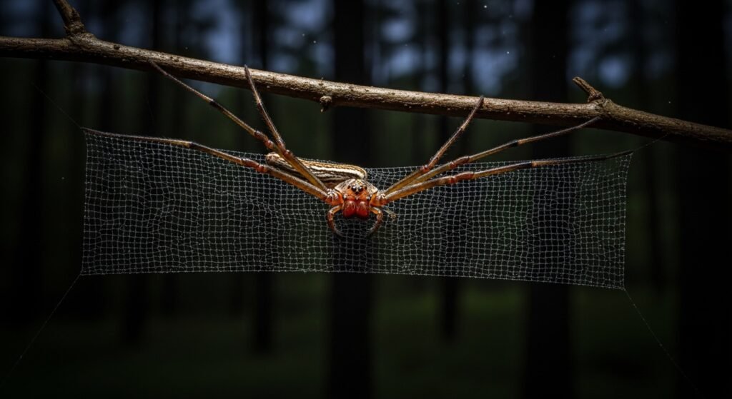 The net-casting spider suspends a small blockish web between its frontal legs and launches it forward to trap passing insects. Unlike stationary webs, this active stalking system requires precise depth perception and timing.