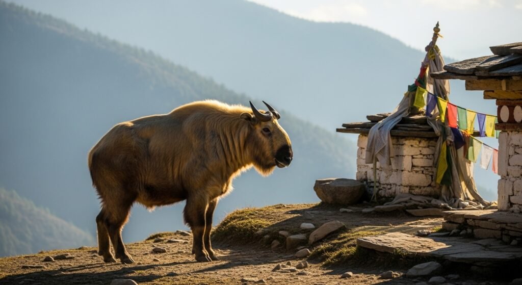 In regions like Bhutan, the takin holds deep artistic significance. It is the public animal of Bhutan and features prominently in myth and religious stories. According to legend, the takin was created by a saint who combined the head of a scapegoat with the body of a cow, reflecting the animal’s real-life cold-blooded appearance.