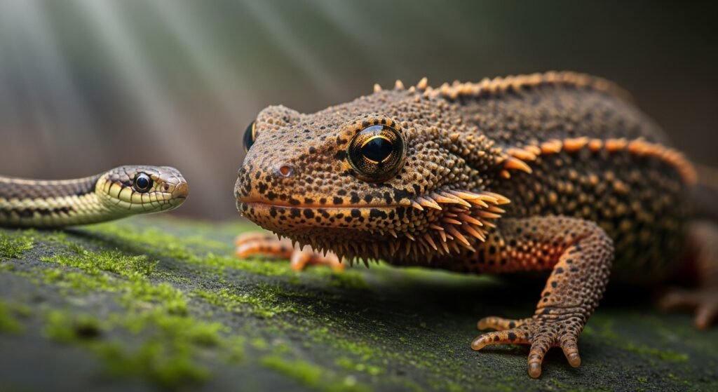 The rough-bearded newt produces tetrodotoxin, a neurotoxin able to stop nerve signals. wildlife that evolve resistance gain a food source, creating an evolutionary arms race between venom strength and impunity.
