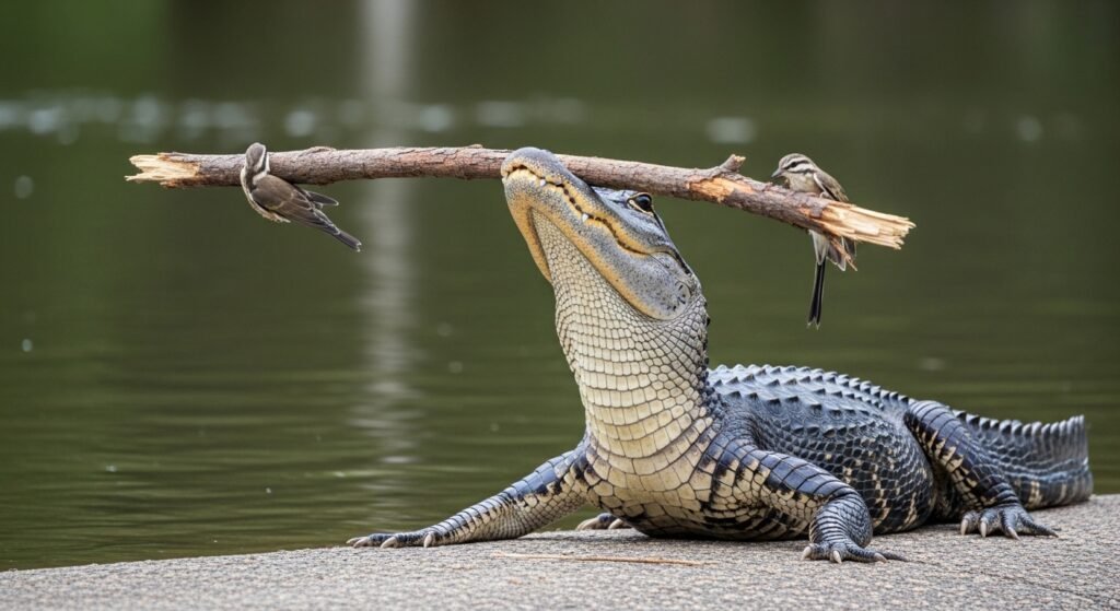 American alligators have been observed balancing sticks on their snouts during birds nesting season. The behaviour attracts birds searching for nest-structure material, bringing prey within striking range. Tool use like this is rare among reptiles and suggests advanced behavioral timing linked to seasonal patterns.