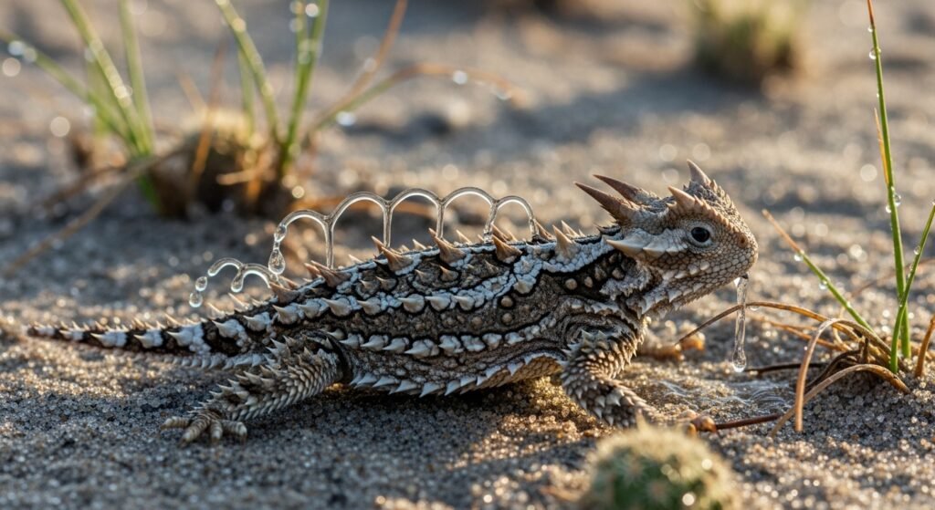 The thorny devil-like Texas horned lizard channels water across bitsy grooves between its scales. These channels form capillary pathways that pull humidity directly to the mouth. Indeed morning dew or damp beach becomes potable. This adaptation is pivotal in thirsty ecosystems where standing water may not live for months.