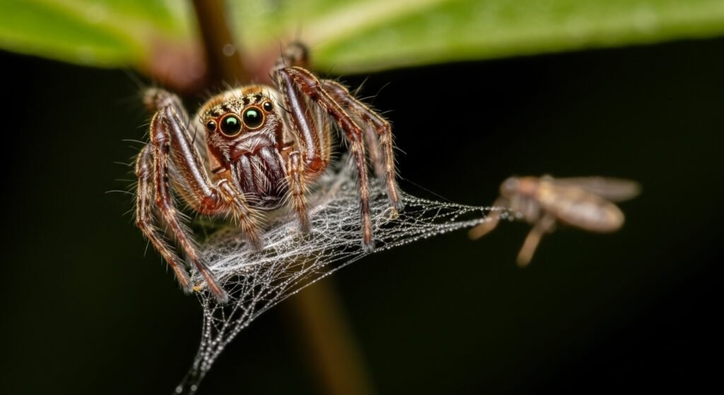 The net-casting spider suspends a small blockish web between its frontal legs and launches it forward to trap passing insects. Unlike stationary webs, this active stalking system requires precise depth perception and timing.