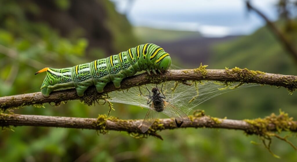 Some native Hawaiian caterpillars trap insects in silk snares and consume them a rare rapacious life among butterfly and moth naiads . Limited factory nutrients on isolated islets likely drove this evolutionary shift.