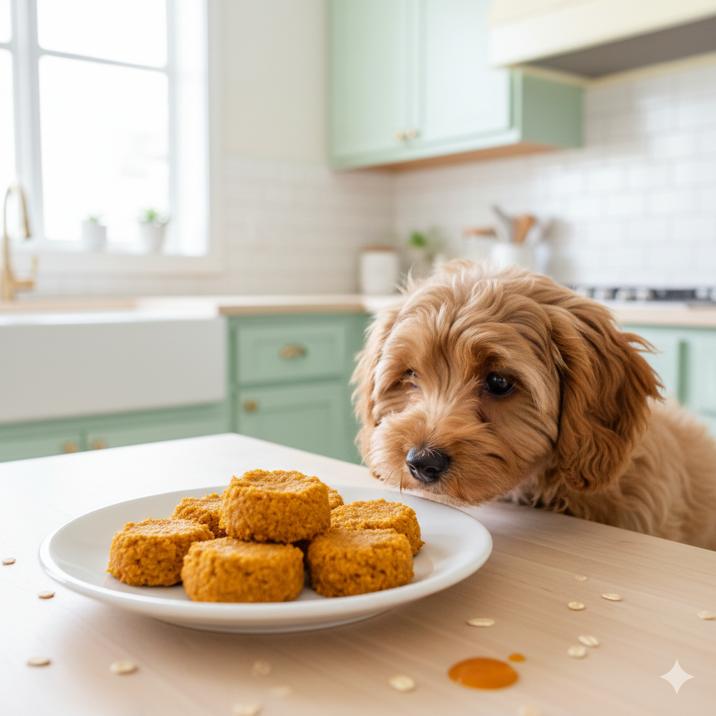 Pumpkin scoops mixed with oats, baked into bouncy balls. Aids digestion, perfect post-walk treat. Homemade ones trend on social media but Farmer’s Dog pre-mades rock. Orange goodness everywhere.