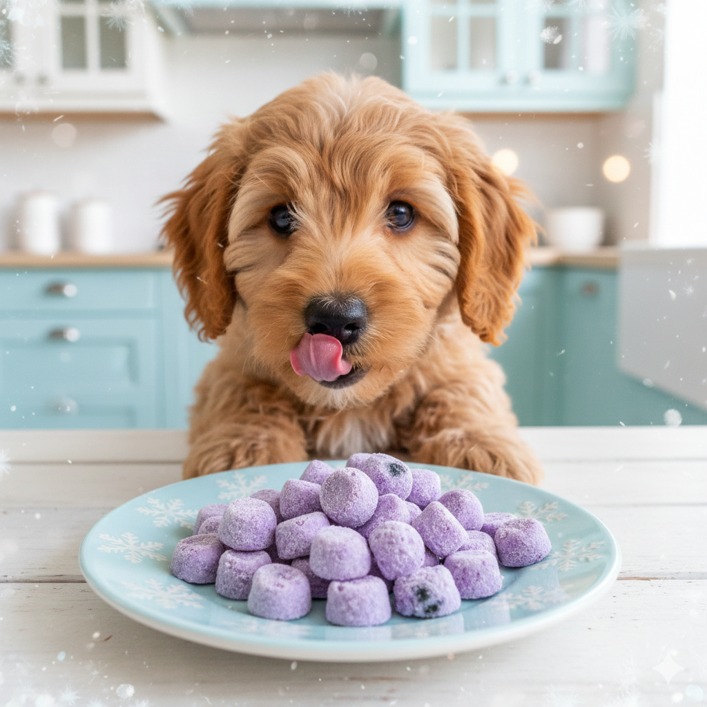 Greek yogurt drops frozen solid, probiotic gut helper. Chippin brand flavors like blueberry hook finicky pups. Tiny size for quick rewards. Tail spins on sight.