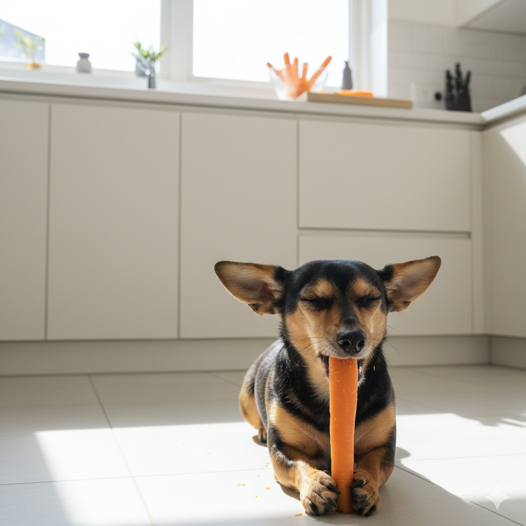 Baby carrots sliced long, raw or lightly steamed for snap. Cheap fridge staple turned treat. My chiweenie crunches them like candy. Vitamin A bonus without calories piling up.
