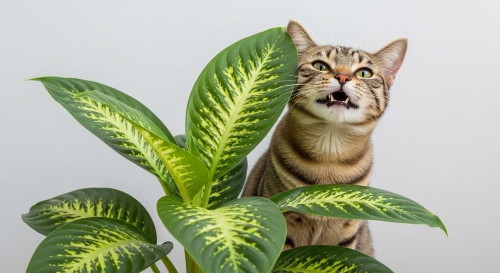 Dieffenbachia contains undoable calcium oxalate chargers that bring immediate infection when swallowed. Cats may show violent oral pain, drooling, swelling of the lips, and difficulty swallowing. While infrequently fatal, the discomfort can be severe and may intrude with breathing if swelling worsens.