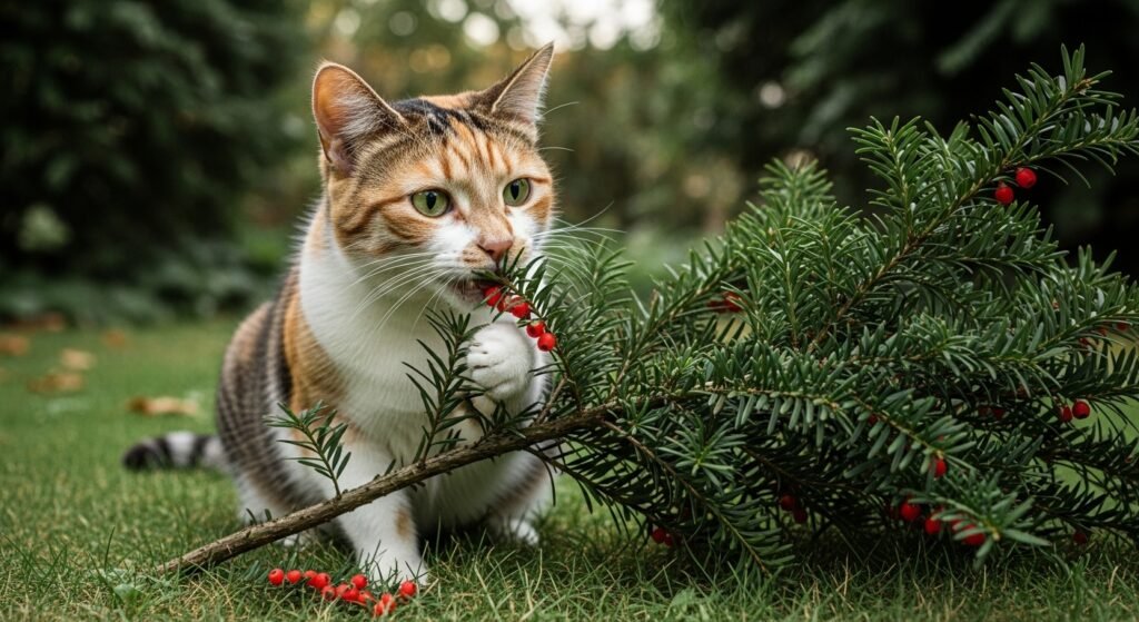 Yew plants are largely venomous and dangerous to cats. They contain taxines that affect the heart and nervous system. Symptoms include temblors, breathing difficulties, weakness, collapse, and unforeseen death. Indeed minimum ingestion can be life-changing .