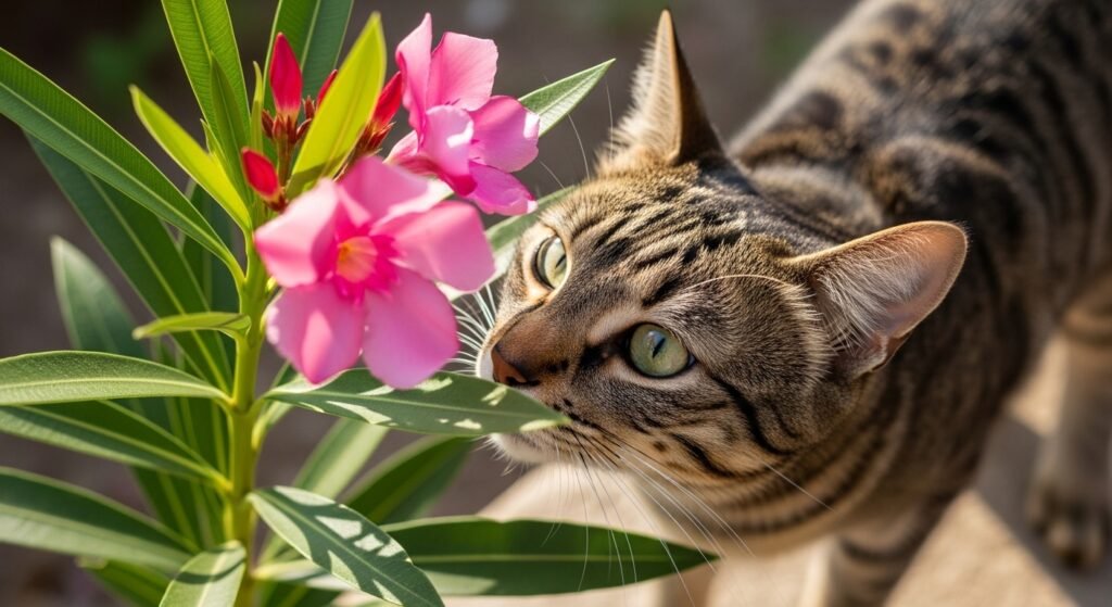 Oleander is largely venomous and dangerous to cats. It contains cardiac glycosides that affect heart rate and function. Indeed small ingestions can bring drooling, puking, temblors, and potentially fatal cardiac failure.