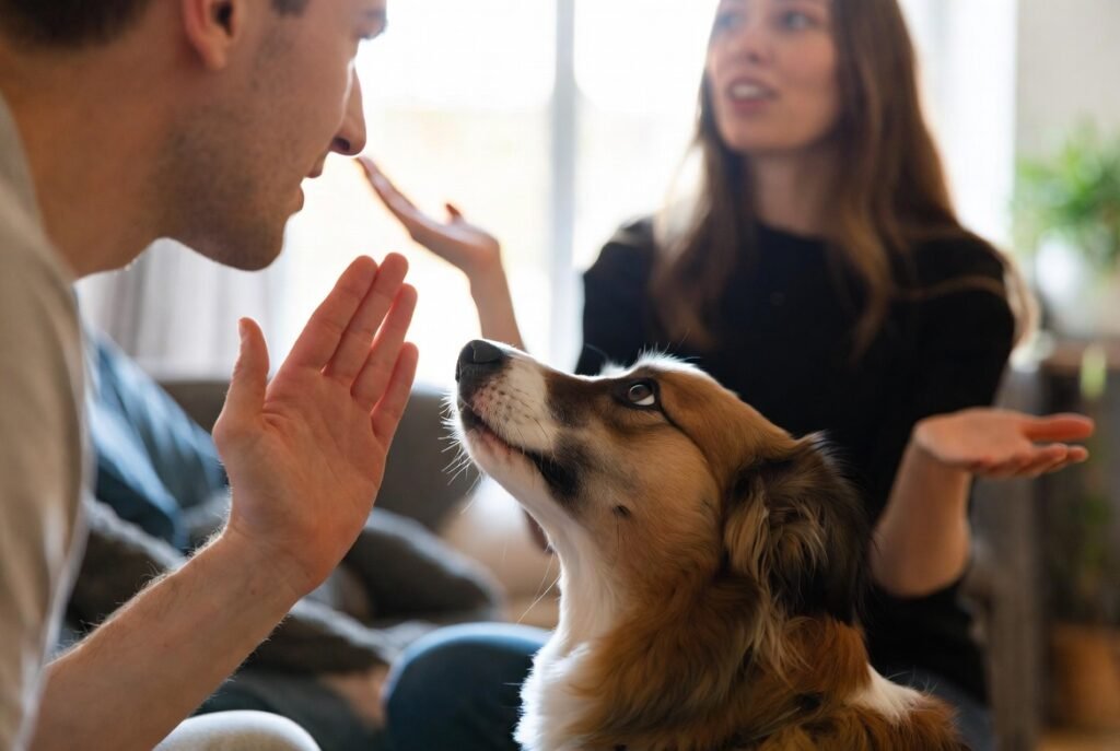Switching between different words for one behaviour prevents clear learning. Dogs calculate on reiteration to associate words with conduct.