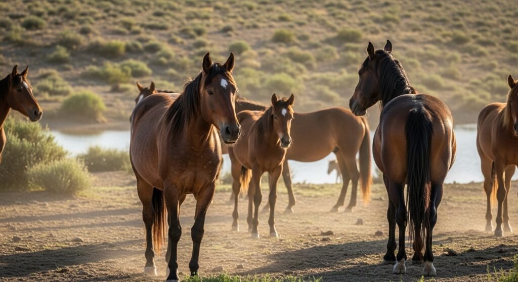 The maturity of mustang herds are led by an intelligent mare who selects water sources and grazing places, while a stallion keeps the herd safe.
