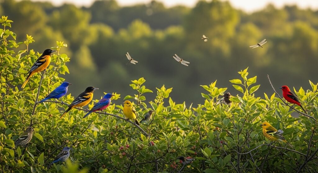 With the return of shrubs and trees along strands, the nesting niche expanded for multitudinous songbird species. Increased growth meant further insects, which further supported avian populations. The changes protruded overhead and outward, impacting species far removed from wolves in the food chain.