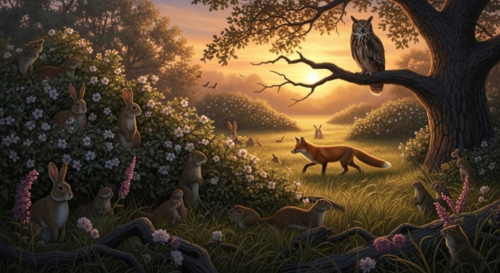 High meadows and shrubs provided better cover from upstanding wildlife. These small mammals, in turn, affected wildlife populations including jingoists, owls, and foxes. Indeed species not directly interacting with wolves were told through altered niche conditions.