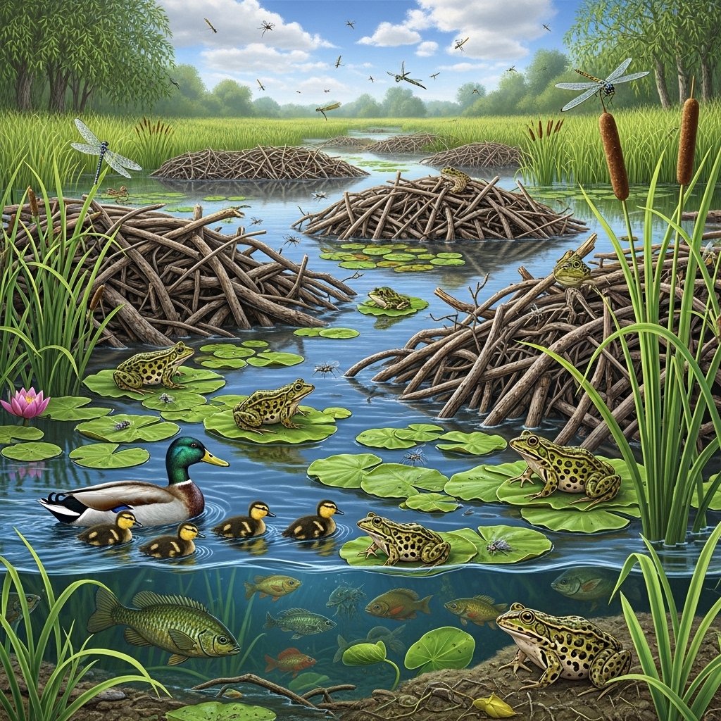 Beavers depend heavily on willow for food and levee construction. When willow populations declined due to overgrazing, beaver colonies also downscaled. As willow stands recovered, beavers returned to areas they had abandoned. These washes provided a niche for amphibians, fish, waterfowl, and submarine insects, amplifying the ecological ripple goods initiated by wolves.